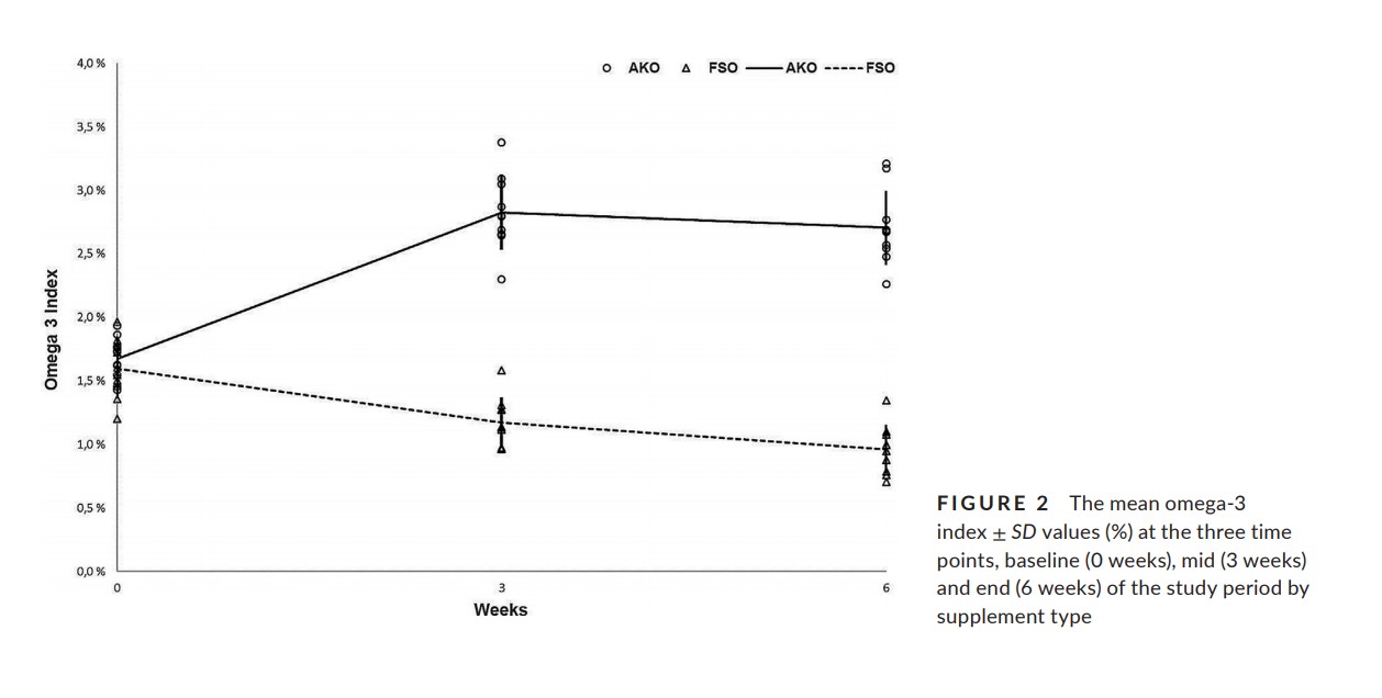 Twenty adult Alaskan Huskies were included in the study. All of the dogs were fed the same complete and balanced dog food; 10 were supplemented daily with flaxseed oil to supply 1.068 mg of ALA and 10 were supplemented with krill oil to supply 1.15 mg of EPA/DHA. The study was 6 weeks in length. Blood fatty acid levels and Omega-3 Index were measured at the start of the study (Week 0), midway through (Week 3) and at the end of the study (Week 6).