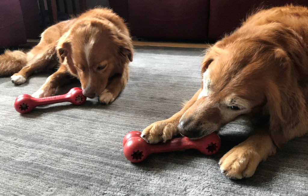 There are a variety of approaches to enhancing a dog’s comfort while alone. Stuff-able bones and food-delivery toys of various forms are both high on this list. In our home, we have used a variety of approaches over the years. Currently, Kong bones stuffed with biscuits or frozen with soft food inside are a favorite.